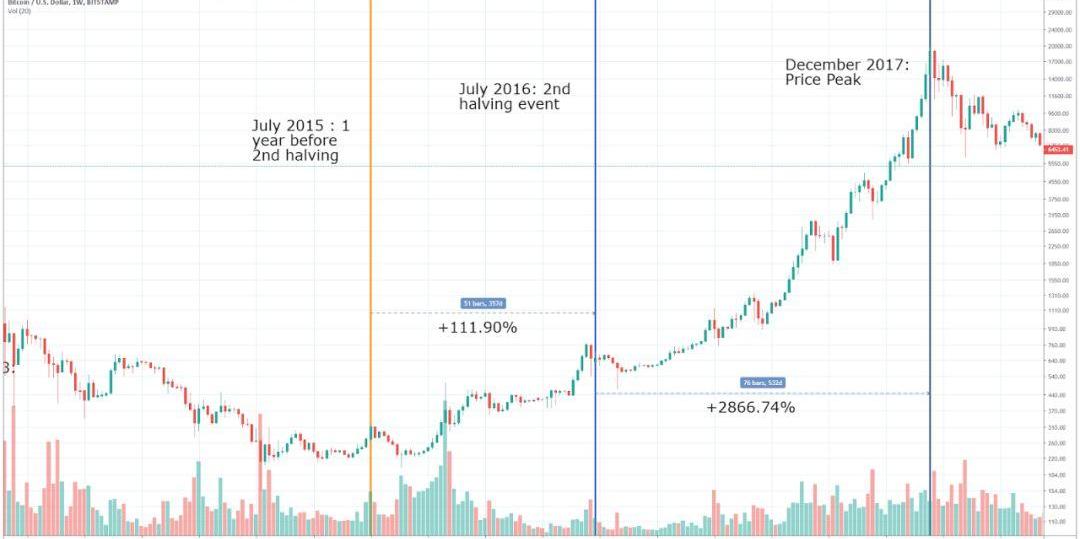 第二個減半發生在2016年7月,使BTC的每日產量從約3600BTC降至目前的約每天1800BTC。?減半前BTC獲得111.9%的漲幅,減半后獲得2866.74%的漲幅,并在2017年12月份收得近2萬美元的歷史最高點。