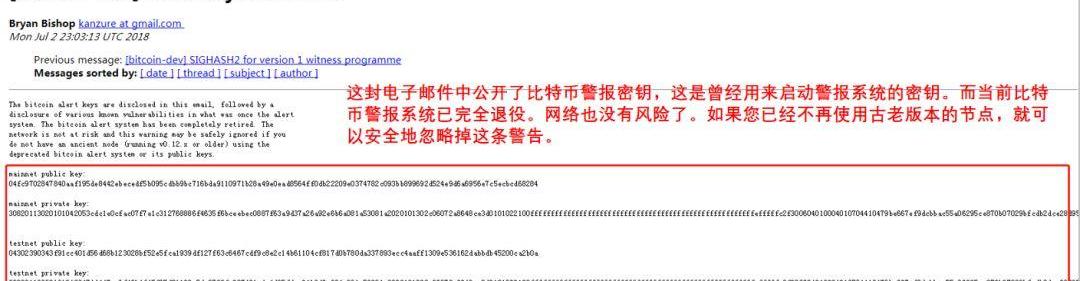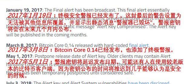 到了2018年7月,隨著較老版本客戶端使用者占比降低至3%以下,隨著絕大部分比特幣山寨幣將警報系統刪除,歷時八年的安全隱患終于在BitcoinCore開發者BryanBishop公開警報私鑰后“完全解除”。