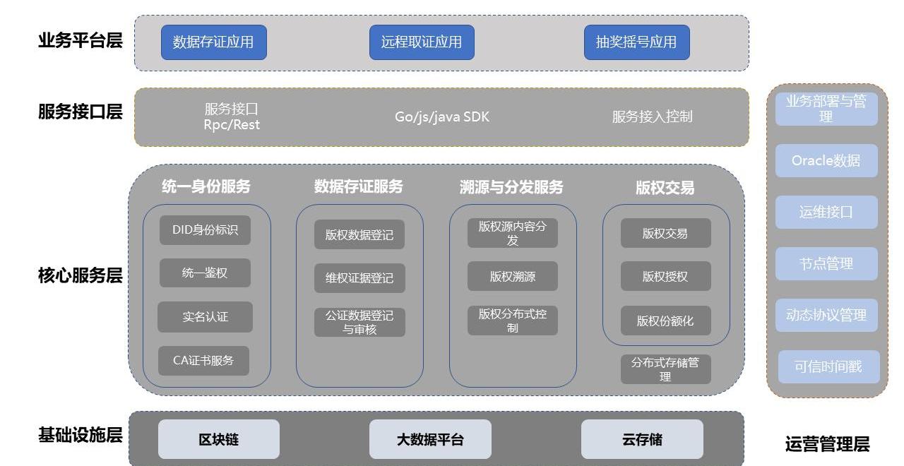 核心服務層:該層是區塊鏈業務落地的獨立服務模塊提供核心數據服務能力,包括統一身份服務,數據存證服務,溯源與分發服務,版權交易服務。目前證信鏈主要使用統一身份服務和數據存證服務模塊。