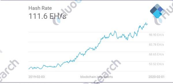 本周比特幣算力上漲。2020年1月27日至2020年2月2日,比特幣全網哈希值平均值為111.6EH/s,相比上周環比上漲0.90%。