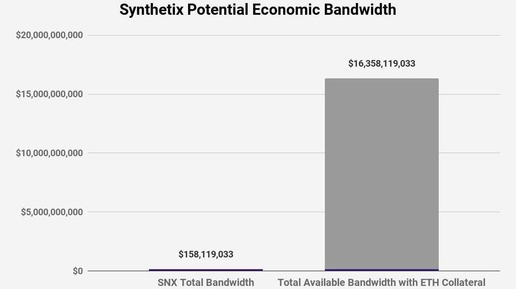 由于目前已有超過86%的代幣流通量被用來充當合成資產的質押物,該協議正在逐漸達到飽和。幾乎沒有空間留給其他代幣了。因此,該協議只能依靠SNX價格上漲來擴大其潛在經濟帶寬了。但是,如果將以太幣作為一種免信任質押物,該協議的總帶寬會擴大100倍以上,從而創建出一系列全新的資產。