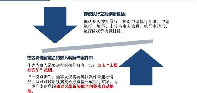 傳統執行立案步驟包括確認是否按期履行,核對申請執行期限,申請執行,并要填寫、上傳各類信息材料,步驟繁復,當事人需填寫及提交的材料也多;對比本案,使用區塊鏈智能合約嵌入調解書中,當事人只需根據案件的履行情況相應點擊,即可跳過后續繁復程序直接完成執行立案,而立案信息均通過區塊鏈智能合約自動抓取。