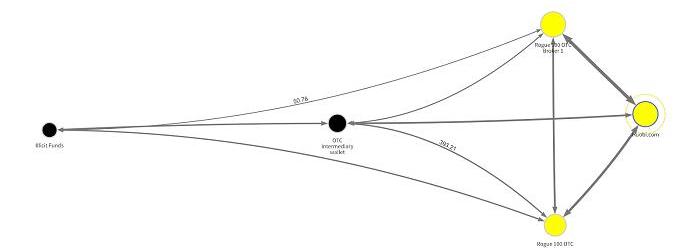 我們還可以在ChainalysisReactor中看到兩個非法場外交易經紀人經常相互交易,下面是“Rogue100”中三個非法場外交易經紀人的示例。
