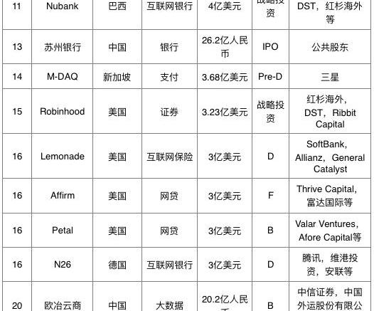 獲得E、F、G輪的公司分別有19、6、2家:中國點融網獲得1億美元的F輪融資;印度移動支付平臺Paytm完成10億美元的G輪融資;美國數字貸款技術公司Blend獲得1.3億美元E輪融資。