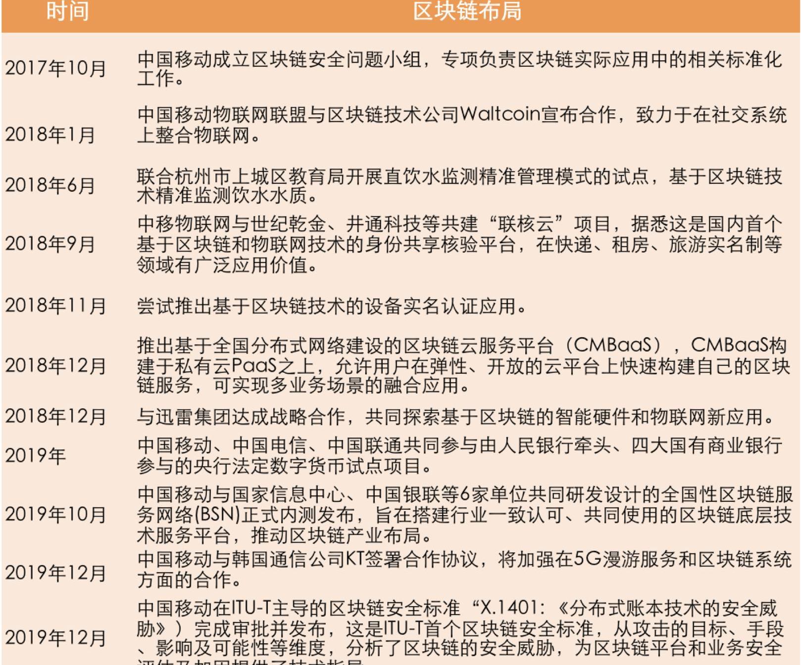 2019年5月,三大運營商牽頭發布了全球首個《區塊鏈電信行業應用白皮書》,詳細探討了電信設備管理、物聯網、云網融合、多接入邊緣計算等8個場景的區塊鏈解決方案及未來發展策略,這是三大運營商在區塊鏈技術領域的首個研究成果,也是全球首個區塊鏈電信行業應用白皮書。