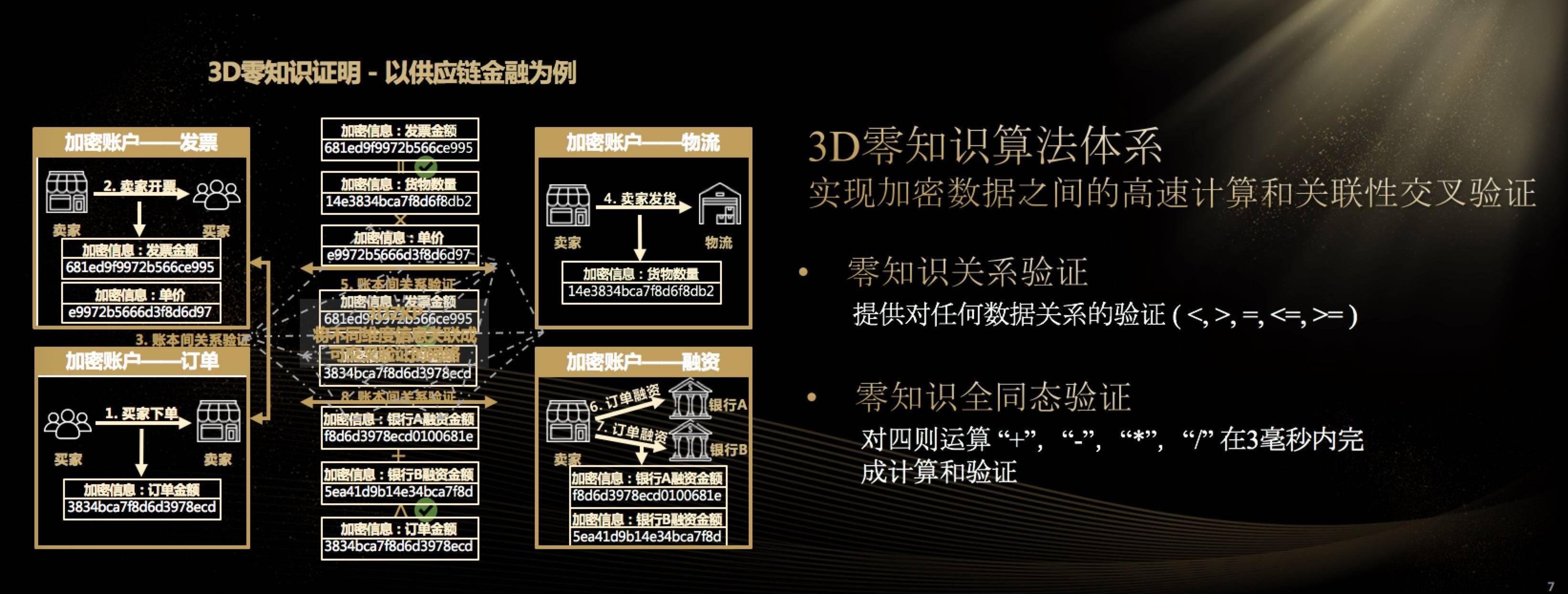 通過密碼學能夠實現一定程度的數據控制,但還遠遠不夠。因為在很多情況下,尤其在跨境貿易場景,數據逐字段加密也不行,因為你的數據壓根不能給對手方看。所以,我們推出了3D零知識算法體系,簡單來說它能做兩件事情:一是所有加密數據的關系,就是“>”“<”“=”,能很快驗證出來;二是它能做零知識全同態驗證,而且是四則運算“+”“-”“*”“/”,在不解密情況下,3毫秒完成計算和驗證的全部流程。在這一點上,我們可能比國際上最接近我們的算法,性能高一萬倍左右。