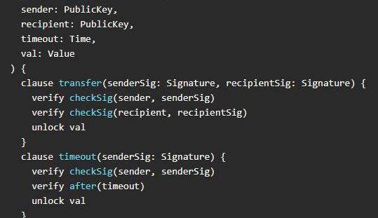 盡管這些高級語言在比特幣中不太重要,但它們確實存在。Ivy是比特幣中「最精致」的高級語言,該語言由DanRobinson于2017年創建。下圖給出了一個用Ivy編寫的智能合約示例。如果接收者未及時使用該合同,則該合約可用于發送可以由發送者收回的款項。