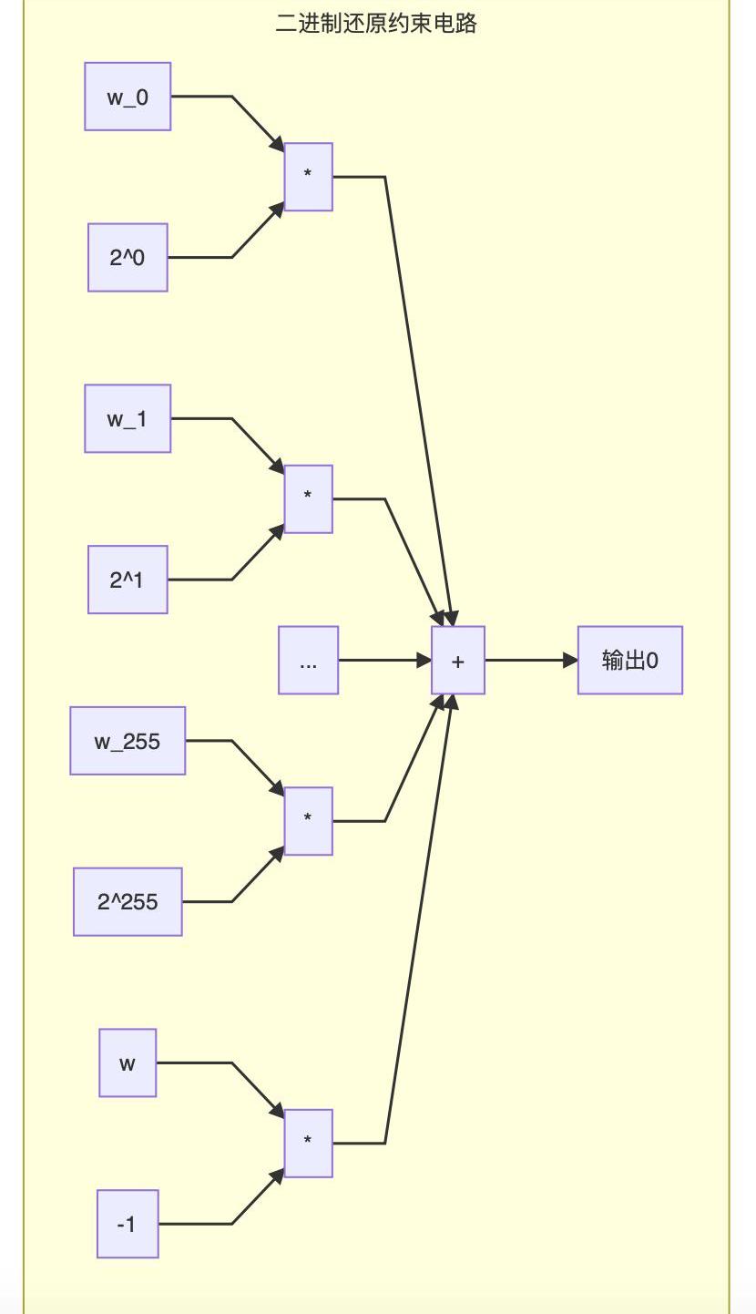 那還有什么方法來約束這個數字w的空間呢?我們可以巧妙借助二進制數的結構。既然我們想要規定w是個整數,并且大于0但小于2^256,那么我們就可以在二進制里,把w拆分成256位,然后分別約束每一位。這樣的話,我們最后得到的電路大小只會和這個數字有多少位成正比,而不會和這個數字的最大上限有關系。復雜度一下子就下來了一大個等級。