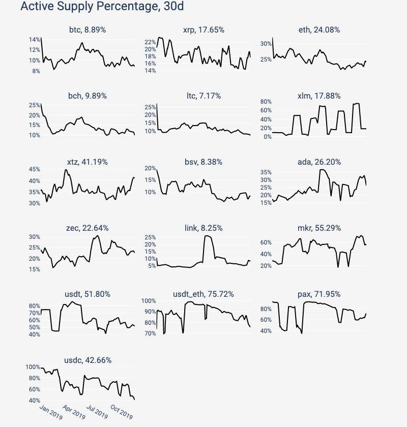 在主流資產中,BTC過去30天的活躍供給百分比從14%降至9%,ETH從32%降至24%。相比之下,穩定幣的活躍供給有很大比例的提升,范圍從50到75%,這表明它們如預期般被用作交換媒介。