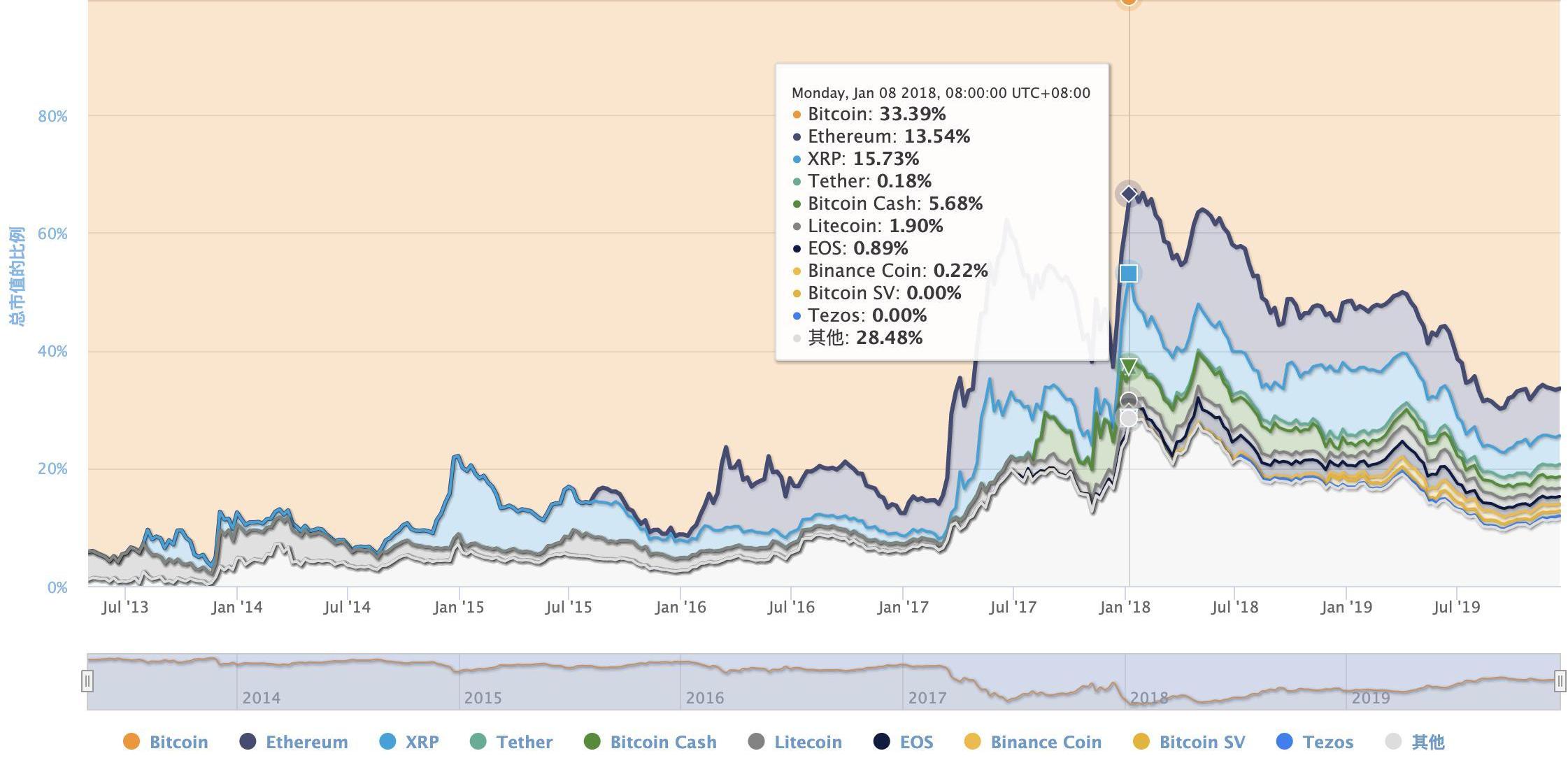 如上圖,2013年4月29日,比特幣占加密貨幣94.17%市場份額,到2018年7月8日,一路下滑至33.39%,歷經整個加密貨幣市場牛熊轉換后,至2019年12月18日,比特幣市場份額再度攀升至66.45%。比特幣市場份額競爭者中不乏推動區塊鏈技術進步的創新型共識建設者,與此同時,令人遺憾的是,同樣多的競爭者中不少是利用區塊鏈技術謀取私利的抄襲型共識破壞者。