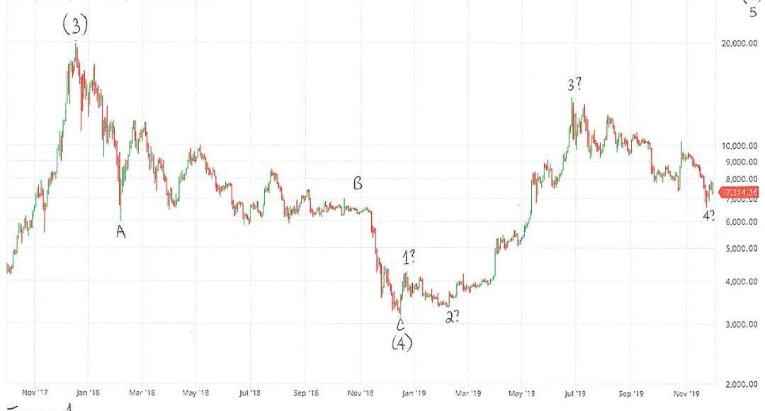 如果到20000美元峰值被結束在(3),那么我們所處(或剛剛走出)的修正波是(4),我們可以期待(5)帶我們去歷史新高(見下圖)。然而,如果峰值的結束為(5),也就是⑤的終點,即周期波Ⅰ的終點。這一解釋意味著我們在它身上看到的修正是我們在比特幣歷史上所見過的最大的修正,從一開始就糾正了整個上升趨勢。