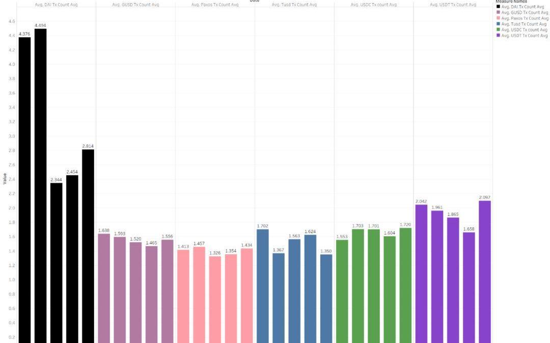 不過,我發現了一個很有意思的數據:任意選取一天,你會發現平均每個地址的交易數都約等于2。DAI的數字最高,其上限可以達到5。