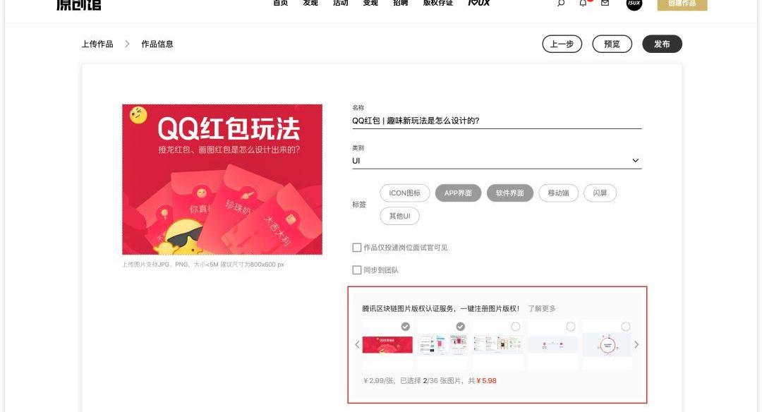 點擊下一步時,你會發現在頁面的右下方,作品中的圖?均已系統提取了出來。我們可以勾選我們需要作版權存證的圖片,選擇后點擊?面右上方的發布。