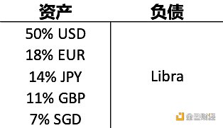 2019 年 9 月,Facebook 公布 Libra 貨幣籃子的構成是:美元(USD) 50%、歐元(EUR) 18%、日元(JPY) 14%、英鎊(GBP) 11% 和新加坡元(SGD) 7% 。