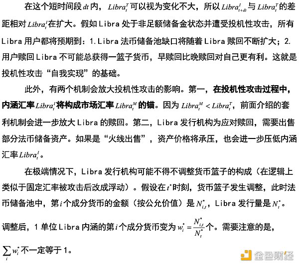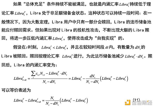 6.「總體充足」條件可以持續一段時間不被滿足。但如果出現對 Libra 的投機性攻擊,Libra 的持續贖回將進一步擴大法幣儲備池缺口,并壓低內涵匯率 ,使得攻擊成為「自我實現」的。套利機制和「火線出售」部分法幣儲備資產會放大投機性攻擊。
