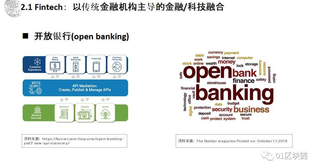 這頁PPT左側展現了“開放銀行”的結構,解釋其如何利用API,通過互聯網實現傳統銀行和其他金融資源、產業資源進行結合,并為終端的消費者提供服務。這樣的機制使得銀行主體和終端直接融合,導致了銀行主體的變化,進而改造了傳統銀行的基本形態和服務模式。傳統銀行之所以必須改變,是因為每天面臨不斷變化的外部環境。這幅PPT列舉了其中的6個問題,解決這6個問題,傳統的金融工具,傳統銀行的框架,傳統銀行的手段,都已經不再可能。