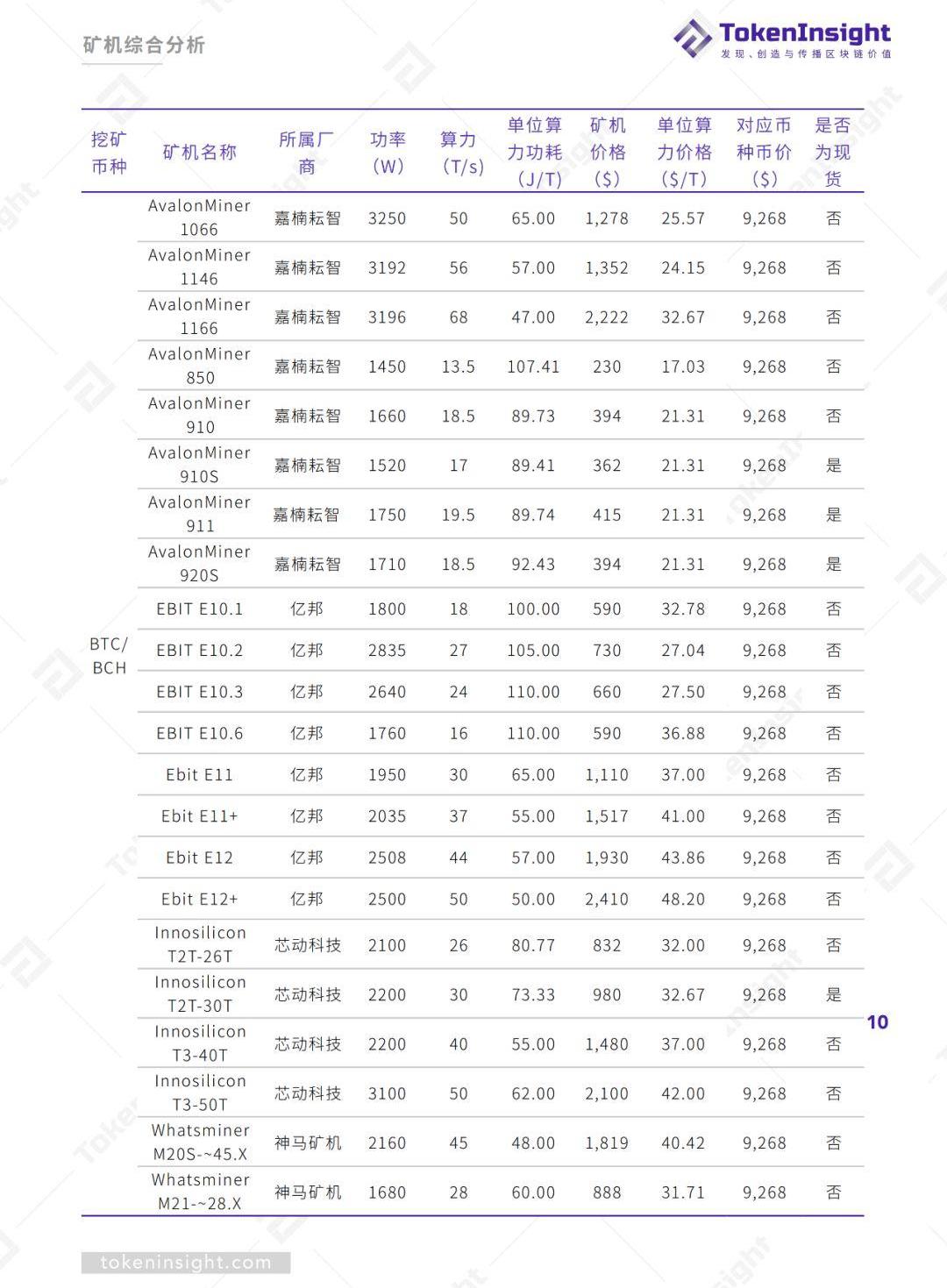 3.2019年下半年,包括比特大陸和嘉楠耘智在內的各大礦機廠商紛紛發售算力功耗比在50J/T以下的礦機。在所有礦機中,AntminerS17+擁有最低的算力功耗比。AntminerT17+取代上一季度的InnosilliconT3-43T礦機成為盈利能力最強的低功耗礦機,在當前難度和幣價下回本周期僅為230天。隨著算力的增長,低功耗礦機將在競爭中逐漸建立優勢。