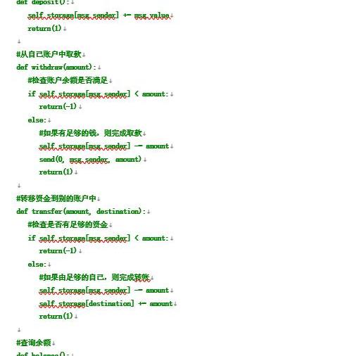 下面是一個自動執行的、有著銀行基本功能的智能合約。一共有四個功能:查詢賬戶余額、存錢、取錢、轉賬,合約代碼如表1所示。