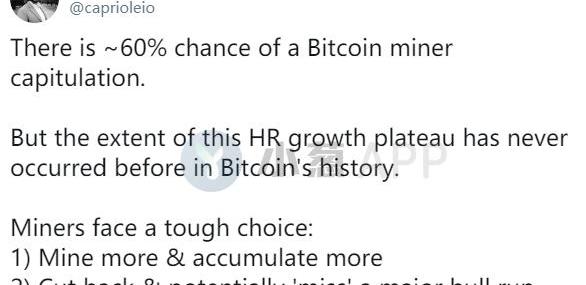加密貨幣分析師CharlesEdwards日前發推指出,最近一段時間里比特幣哈希率數據的變化暗示礦工們又要迎接“命運抉擇”了,究竟是繼續硬抗并承擔虧損,以此希望自己不要錯過可能很快會到來的下一輪牛市,還是“投子認負”暫時退出這個市場,礦工們可能需要盡快做出自己的選擇。而據Charles估計,可能會有高達六成的礦工會在短期內與市場告別。