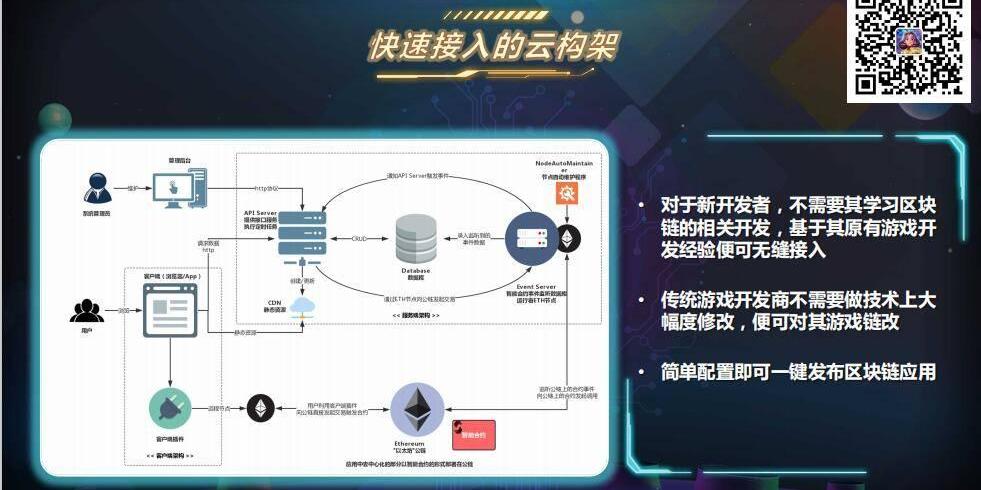 C/S云的構架就是讓開發者不需要學習底層智能合約、各種網關等區塊鏈相應技術。我們已經把它封裝好。傳統游戲商來說也不需要改變太多編程語言,可以直接用你喜歡的語言,甚至在已經成型的游戲可以非常方便地鏈改。我們做了兩個橋梁,分別連接開發者和區塊鏈世界、區塊鏈游戲和用戶的世界。剛剛連接了開發者,現在連接的是用戶。這是一個發行的SDK,封裝起來為開發者提供更簡便的開發流程,省掉70-90%的時間。