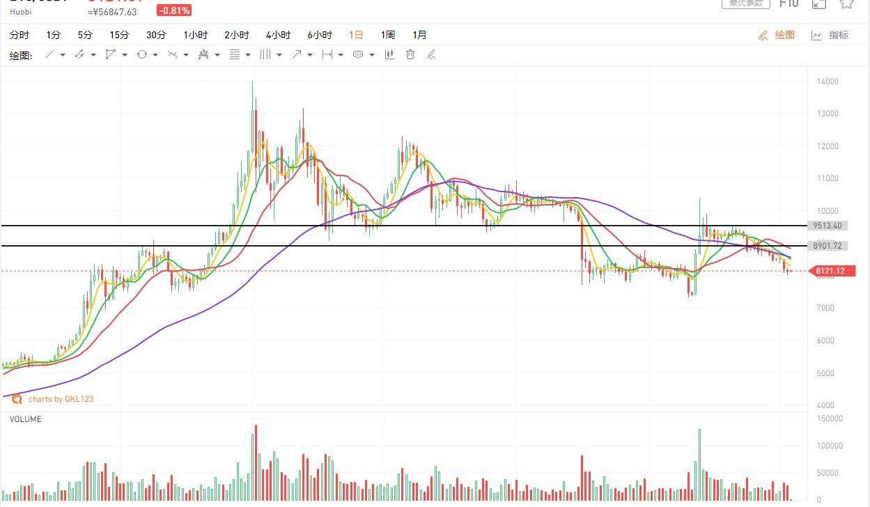 BTC昨天最低下探至8005美元,近期的幾個陰線的下跌都是放量的,估計是之前進場的資金現在在分批離場,從周線級別來看,BTC已經擊穿了之前那根大陽線的一半位置,反反復復的陰陽相交的走法對多頭消耗是非常大的,從日線級別來看也不太樂觀,短期的幾根均線已經形成空頭排列,對幣價形成一定的壓力,下面只有一個年線支撐了,陰跌的走勢最磨人,我還是建議大家謹慎參與,等趨勢明朗再做決斷,看消息進場做多的有生力量已經大半被套住,剩下的或許會掙扎一下,短期內可能會有小幅反彈,但是參與性不高,保持觀望,若該標的再次回到前期低點7300美元附近,則說明該標的已經完成了對頭部頸線位的反抽動作,市場會再創新低。