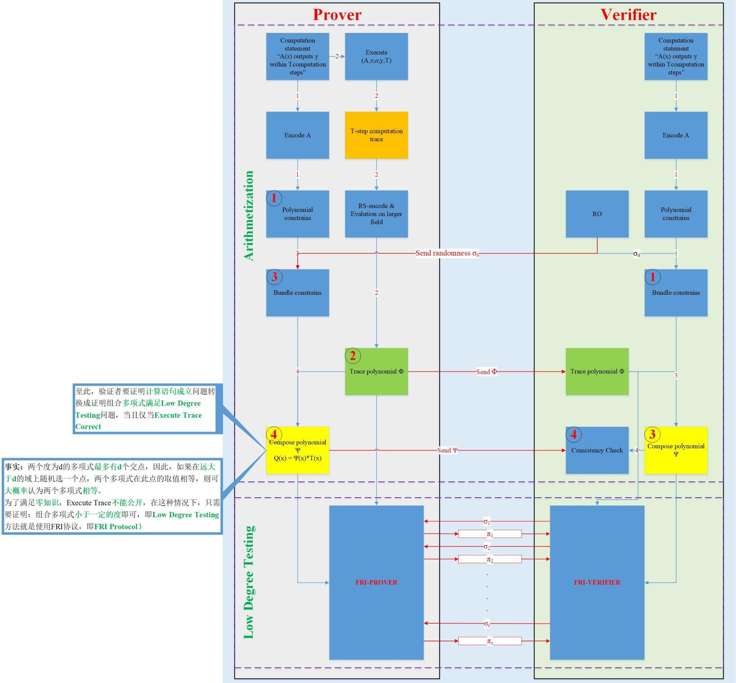 和zk-snark類似的是,兩者都把CIstatement轉換成了證明多項式等式成立的問題。為了防止驗證者作惡,必須要保證多項式是低于某個度的。不同的是,zk-snark使用了trustedparty機制和同態加密等數學方法,而zk-stark使用了低度測試等數學方法。當且僅當多項式真正的小于某個度時,多項式的相等才是真實意義上的相等,說明生成軌跡多項式的executetrace是正確的,即原始CI成立。