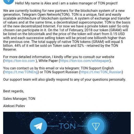 早在2018年初,一些不知名的騙子忽悠互聯網用戶購買Telegrammessenger的代幣GRAM。據稱由TON區塊鏈系統的創建者簽署的一封信當中,包含了騙子的虛假項目網站鏈接。攻擊者暗示用戶注冊網絡,欺騙他們成為第一批以5000美金購買3,000GRAM代幣的吃螃蟹者。