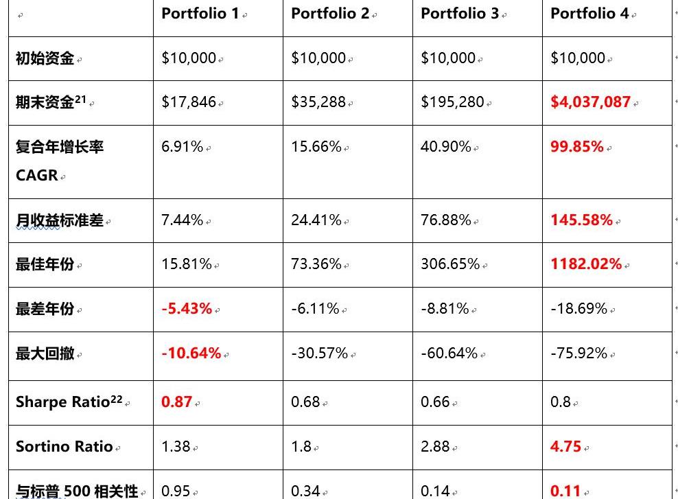 從表10可以看出,隨著風險偏好的上升,為了獲得最高的收益,模擬投資組合對傳統低風險債券的配置迅速下降。但即使目標年化波動率只有5%或更低配置1%左右的比特幣仍然是非常好的選擇。