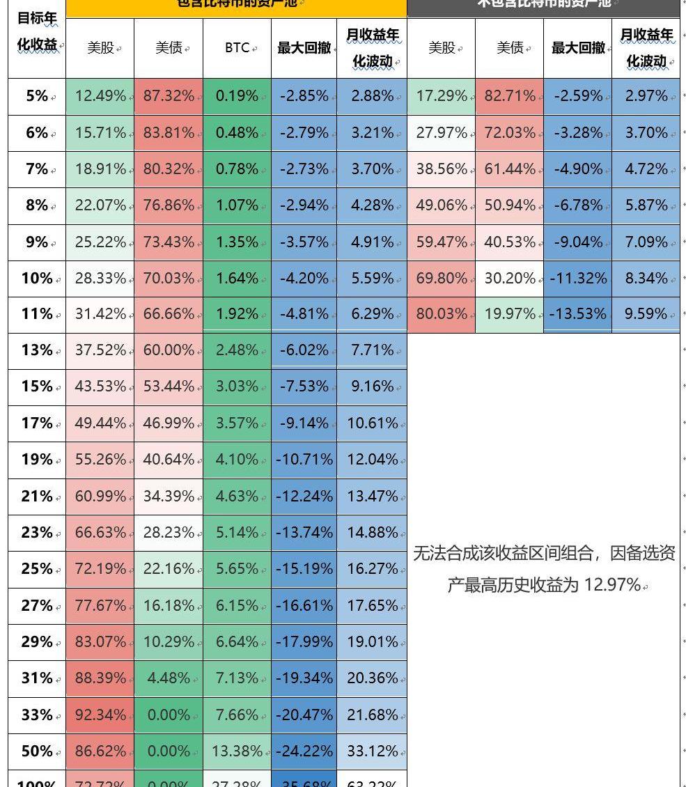 當然,當目標收益過高時,例如在提供的資產池下大于12.97%,傳統資產無法滿足目標收益,模擬投資組合將不得不在比特幣上被動分配權重,結果的意義將非常有限。