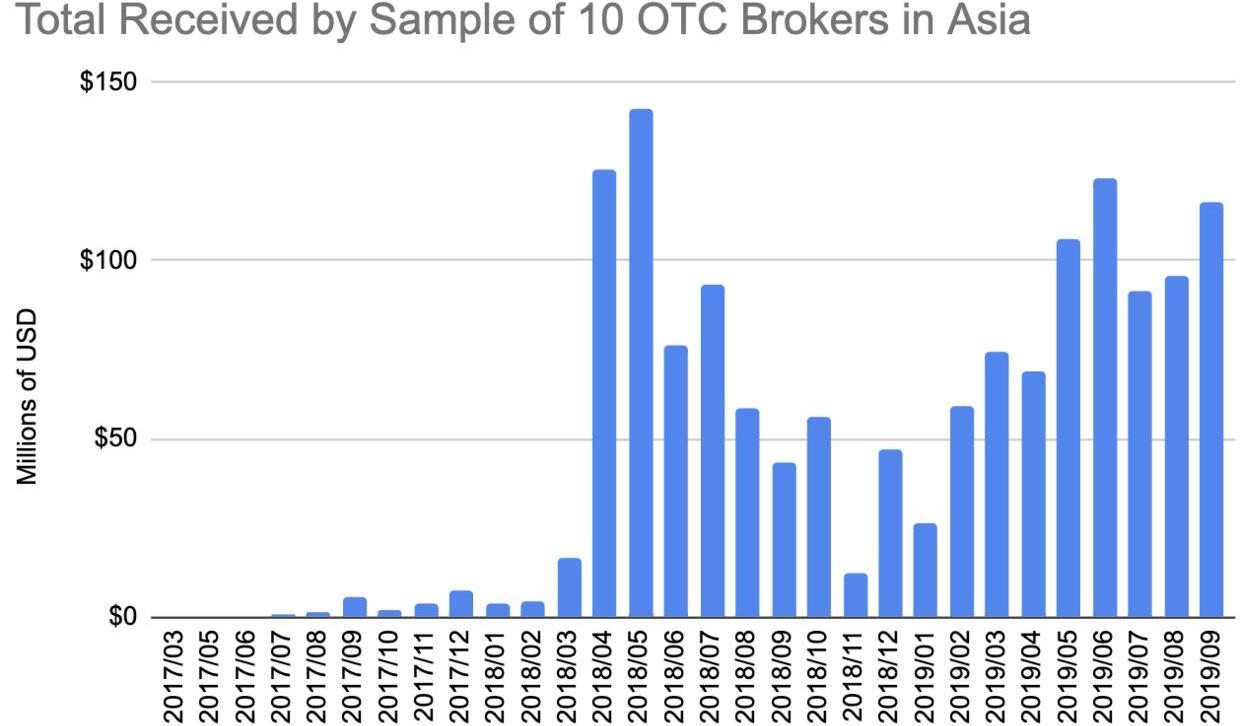 從2018年9月到2019年9月,我們統計了10名場外經紀人的交易量,在過去12個月中交易了8.77億美元到5.77億美元。