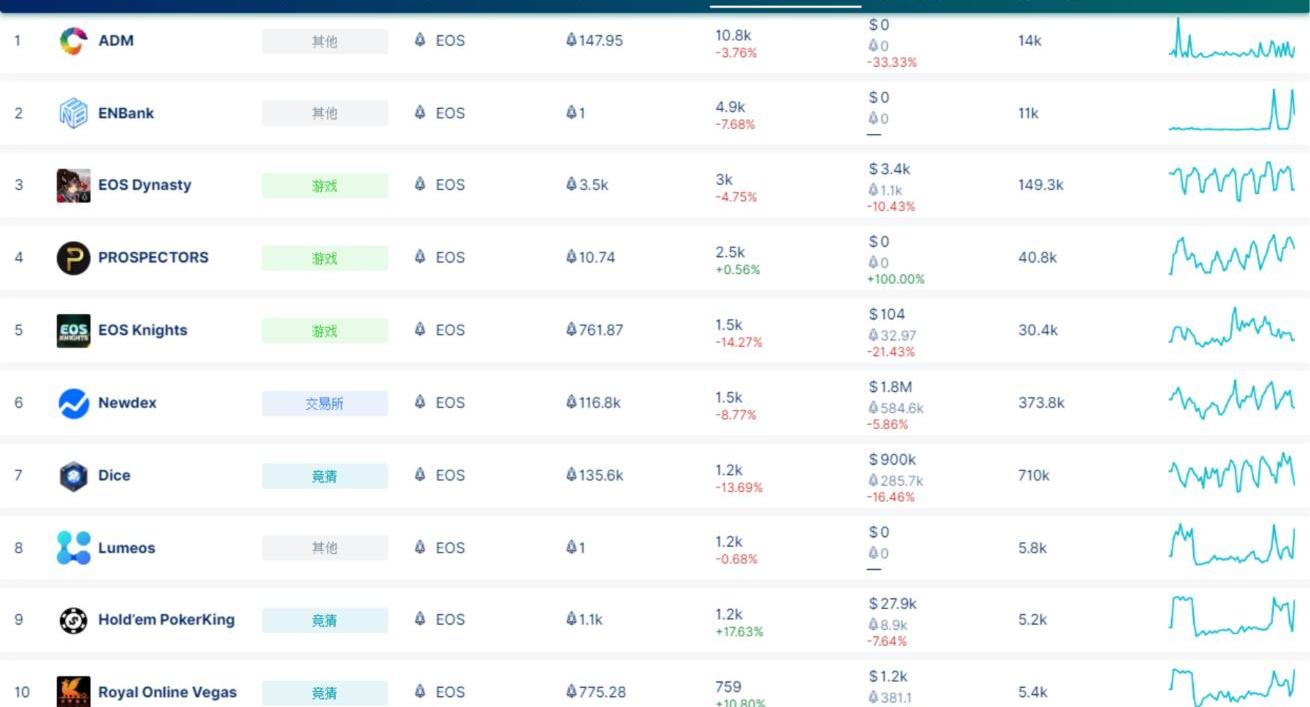 據DappRadar統計數據,24小時EOSDApp整體活躍程度有所回落。游戲EOSDynasty的24小時用戶數3k,較昨日變化-4.75%;交易應用Newdex的24小時活躍用戶數1.5k,較昨日變化-8.77%;競猜應用Dice的24小時活躍用戶數1.2k,較昨日變化-13.69%;數據應用Lumeos的24小時活躍用戶數1.2k,較昨日變化-0.68%。