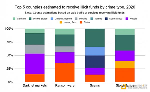 根據接收這些資金的服務的用戶位置的細分,以下國家從非法地址接收的加密貨幣數量最高: