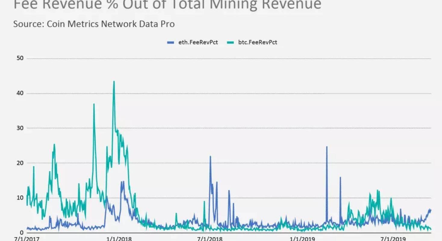 我們再來看一下ETH交易費和BTC交易費在礦工收益中所占的百分比變化(備注:礦工的收益=區塊獎勵+交易費)。見下圖:
