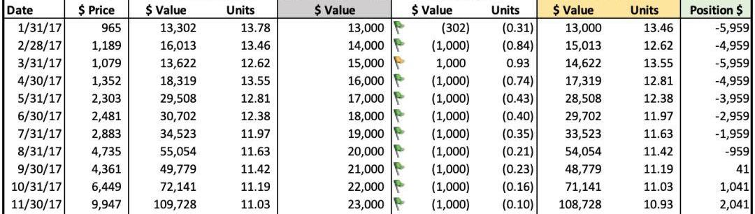 我們最初的比特幣頭寸是零,也就是比特幣的數量,單位都是美元。我們的目標是比特幣持倉量每月增加1000美元,所以第一個月比特幣持倉量的目標是1000美元。