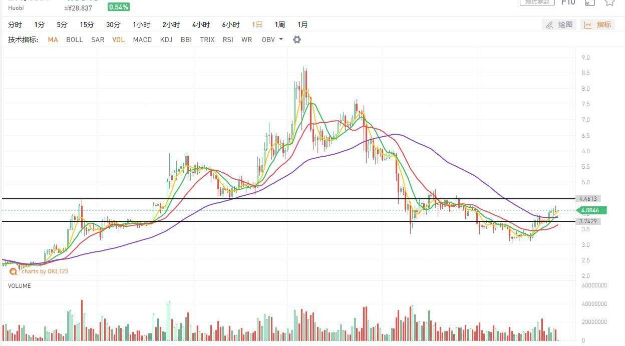 EOSEOS領頭羊的位置被ETH搶走了,根本原因還是該標的的量價配合不理想,現在依舊沒有改善,龍頭走的不理想,下面的小弟也不會走多遠的,成交量沒有明顯放大的跡象,所以暫時還是看超跌反彈,上方的壓力位在4.45美元附近,以目前的成交量該點位很難被一次性通過,但是應該還是會晃晃悠悠的上去摸一下,所以到達該點位建議高拋,若放量突破該壓力位則會改變目前下跌的趨勢,但是可能性比較小。