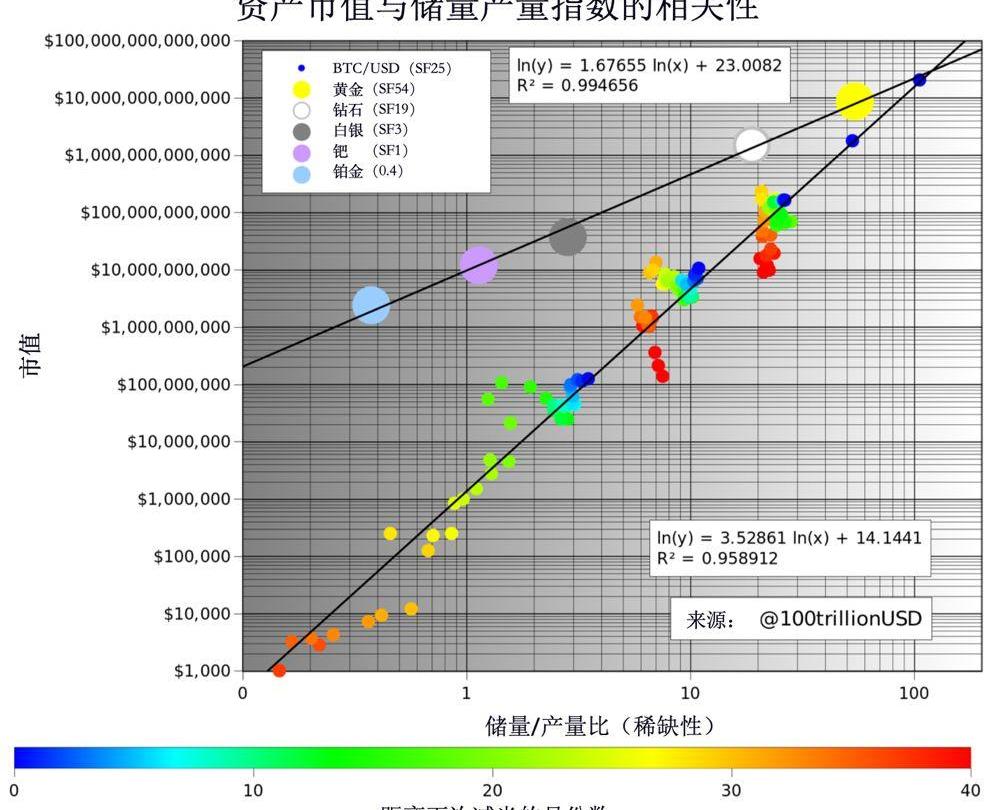 為什么這個模型有用呢?是因為這個模型原本是黃金的開采量模型,而比特幣的挖掘量和它的相關性卻高達到94.7%,所以可以認為它們相關。通過圖表可以看到,在過去的這段時間里,比特幣的稀缺性是越來越強的,目前已經可以達到白銀的級別。它的產量每下跌一次,稀缺性就會翻倍一次,也就是說,幾乎兩次減半之后,它的稀缺性就可以達到黃金的級別。