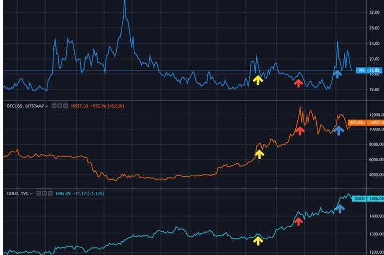 值得注意的是,除了BTC和黃金之間的強相關性以外,BTC與芝加哥交易所的波動率指數的相關性也變得日益密切。
