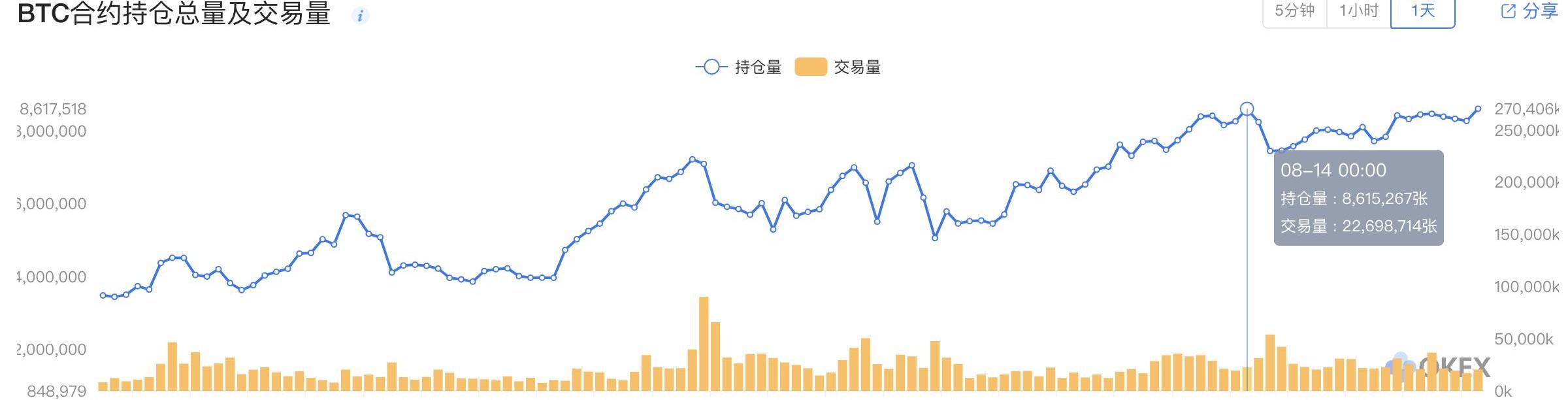 現貨市場低迷,期貨合約市場的持倉量卻高居不下,投資者都在持倉等待變盤。橫盤意味著低振幅,對于合約交易來說,要在低振幅中獲得高利潤,必然要加大持倉量。因此,實時結算或者每日結算提取的資金很有可能會繼續流入到新開的合約中。穩一些的投資者或許會多開一些新的頭寸,而急躁者則可能在開倉的同時加高杠桿。