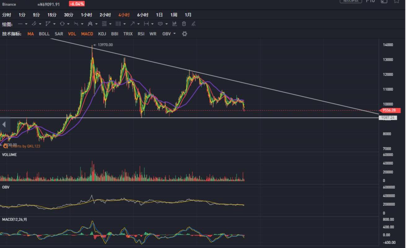 今日凌晨01時前后,BTC被小幅拉升至10200美元后放量快速下行,目前最低觸及9500美元,空軍暫時得到壓制,但多軍反攻意愿不強,市場不確定性依然較大。從4小時k線來看,BTC跌破日線上行收斂三角,若短時不能上行收斂則很可能繼續下探支撐位。