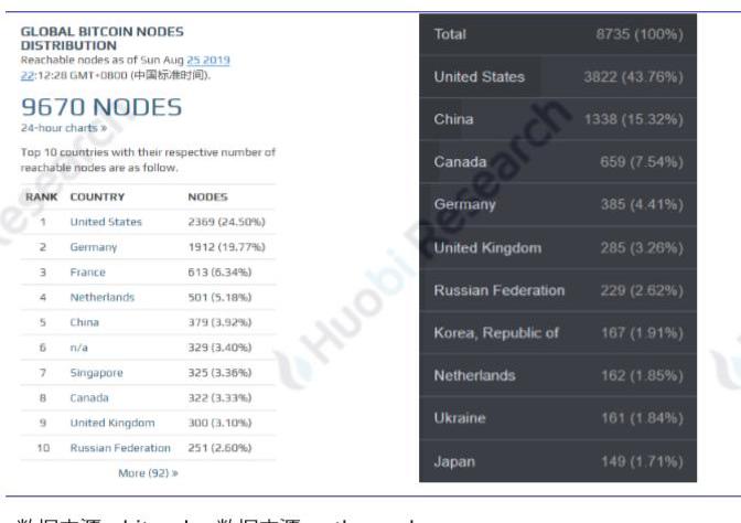 比特幣、以太坊驗證節點數均環比上升。截止2019年8月25日,比特幣驗證節點達到9670個,環比上升2.23%,其中美國有2369個節點,占比24.50%;德國有1912個節點,占比19.77%;中國排名第五,有379個節點,占比3.92%。