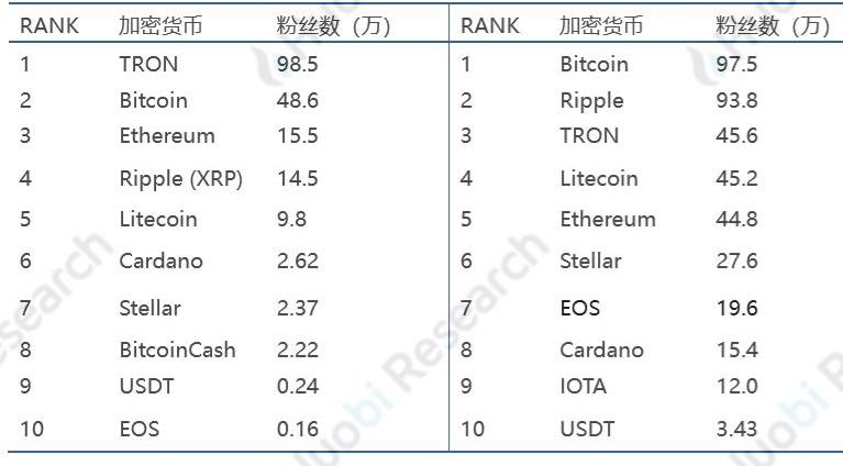 截止2019年8月25日,Facebook中Tron、Bitcoin和Ethereum的公共主頁關注數分列前三,分別擁有98.5萬、48.6萬和15.5萬粉絲。Twitter中,粉絲數前三的項目為Bitcoin、Ripple(XRP)和TRON,粉絲數97.5萬、93.8萬和45.6萬。