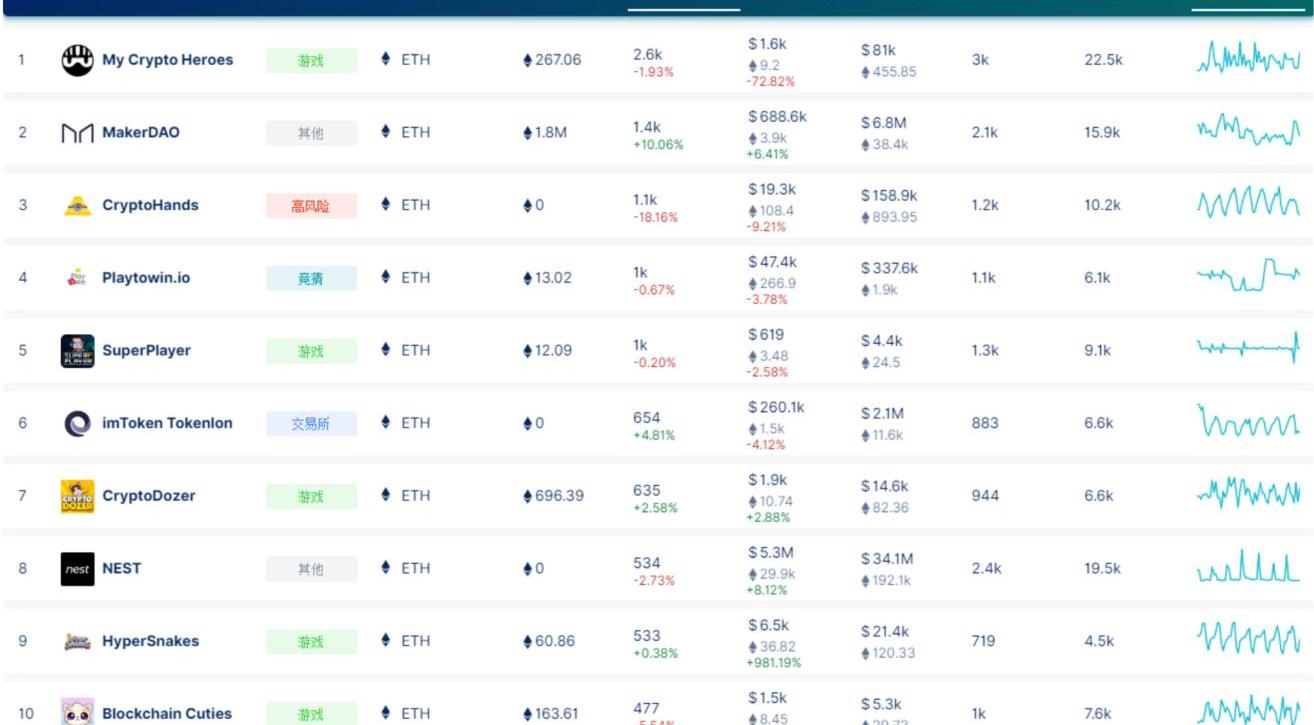 觀察DappRadar統計數據,24小時ETHDApp整體活躍程度略有增加。其中,游戲應用MyCryptoHeroes的24小時活躍用戶數2.6k,24小時變化-1.93%;金融應用MakerDAO的24小時活躍用戶數1.4k,24小時變化+10.06%;交易應用imTokenTokenlon的24小時活躍用戶數654,24小時變化+4.81%。