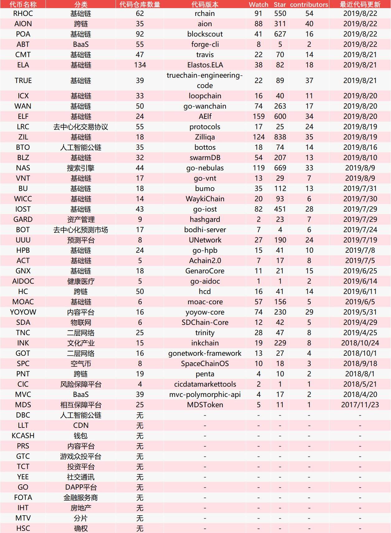 以被watch和Star最多的代碼版本作為觀察對象,MDS在2018和2019年間未更新代碼,MVC、CIC、PNT、SPC、GOT、INK這6個項目在2019年未更新代碼。GNX、AIDOC、HC、MOAC、YOYOW、SDA、TNC這7個項目在2019年下半年之后不再更新代碼。
