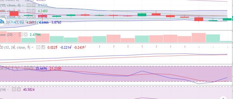 當前已經打破了布林帶下軌,雖然走勢回歸到布林帶是區間通道內,但一度遭遇到5日均線壓制,導致反彈未能形成有效的突破,STOCH指標金叉向上,反彈還會給到,但MACD指標保持平行,且快慢線即將相交,多頭情緒低迷,量能也處于萎靡的狀態,短期很難形成較強的上漲姿態,短期建議多單為主,逢低入場,有效回歸到0.30站穩后進入震蕩行情。