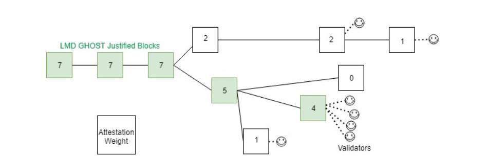 上圖中體現了由最新消息驅動的分叉選擇規則:綠色區塊表示經由LMDGHOST分叉選擇規則證明了的區塊,笑臉符號表示最新的驗證者證明(attestations),某個區塊中的證明總量(笑臉總數)就是該區塊的權重,用區塊中的數字表示。