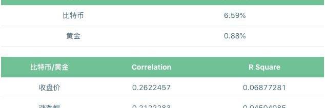 首先,我們采集了6月15日到8月15日的比特幣和現貨黃金的收盤價格以及漲跌幅數據。并以此計算出這三個月的波動性。根據計算得出,比特幣的波動性為6.594%,遠遠高于黃金的0.884%。同時比特幣與黃金之間的收盤價變化的相關性為0.2622457,漲跌幅變化的相關性為0.2122283,呈弱相關性。但RSquare的數據都小于10%,意味著不到10%的數據可以被回歸模型解釋。