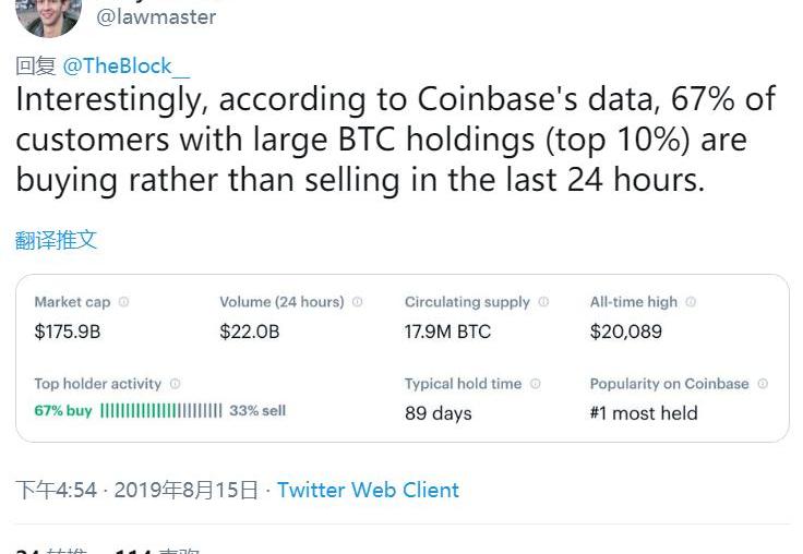 “有趣的是,根據Coinbase的數據,持有大量BTC的客戶中,67%在過去24小時內選擇了買入而不是賣出。”