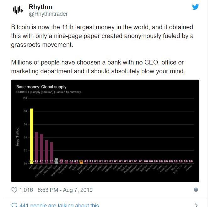 XRP/HKD-4.02%加密貨幣交易員和分析師Rhythm在推特上指出,比特幣目前是全球第11大貨幣。對于一個10歲的后起之秀來說,這是相當令人印象深刻的,尤其是其源于一份9頁的匿名白皮書。