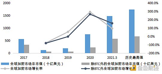 全球加密數字貨幣市場規模從2013年的104億美元增長至2020年的7647億美元,年復合增長率超過了3.2%,僅2020年市值就增長了將近5700億美元,增幅高達293.1%,不僅如此,2021年加密市場依舊勢頭高昂,截至2021年3月3日,2021年僅歷經了兩個月零三天,加密市場規模就又擴大了94.5%。