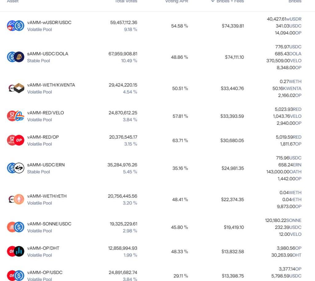 根據Velodrome4月26日的賄賂數據,活躍的Pool有248個,其中周賄賂金額前10的Pool的賄賂金額都在13000$以上,周賄賂在1000$以上的Pool有49個。